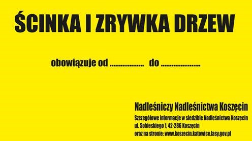 Nadleśnictwo Koszęcin uprzejmie informuje, że wszystkie powierzchnie, na których prowadzona jest ścinka i zrywka drewna objęte są okresowym zakazem wstępu do lasu i oznaczone w terenie tablicami wg. wzoru: